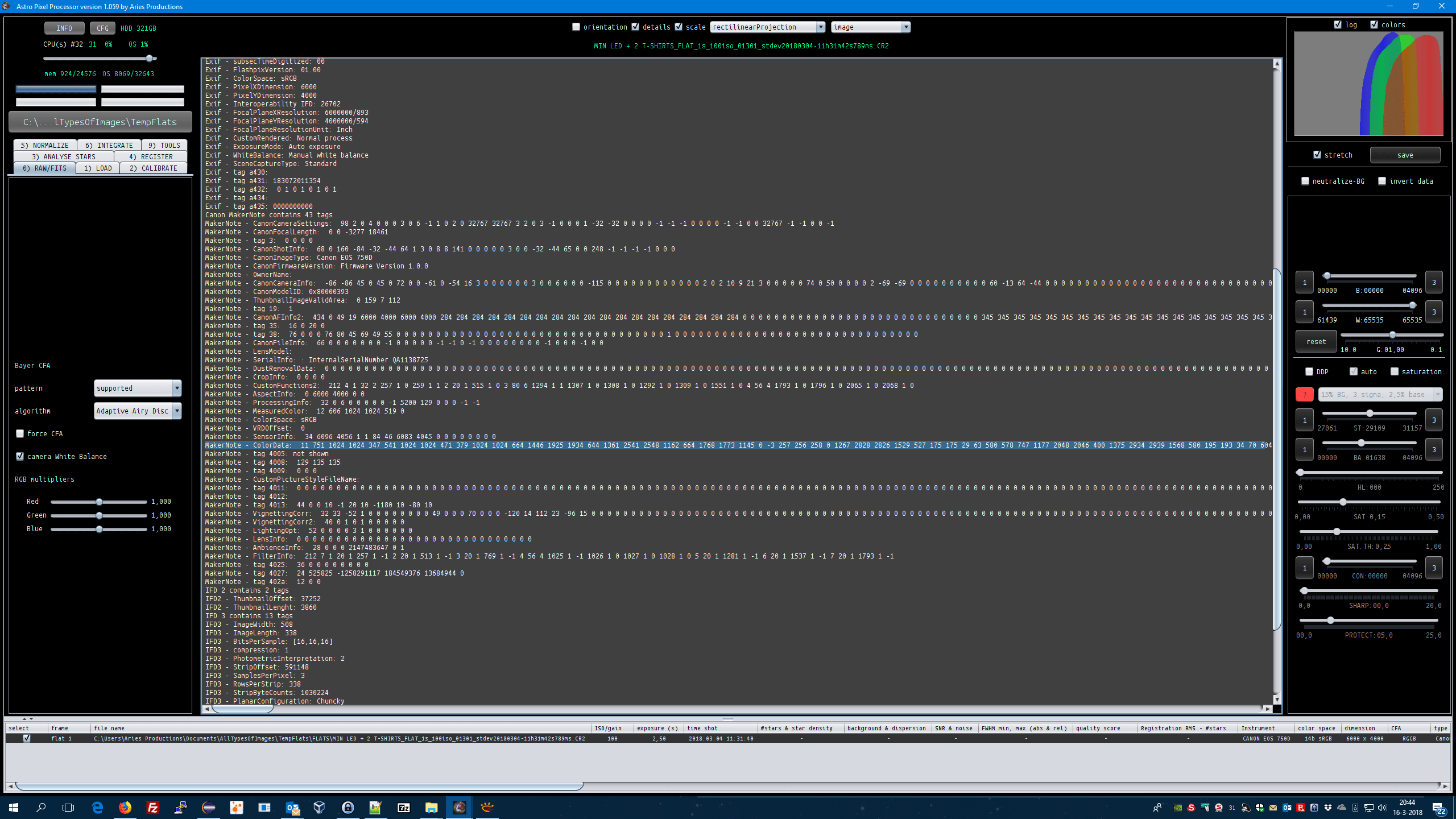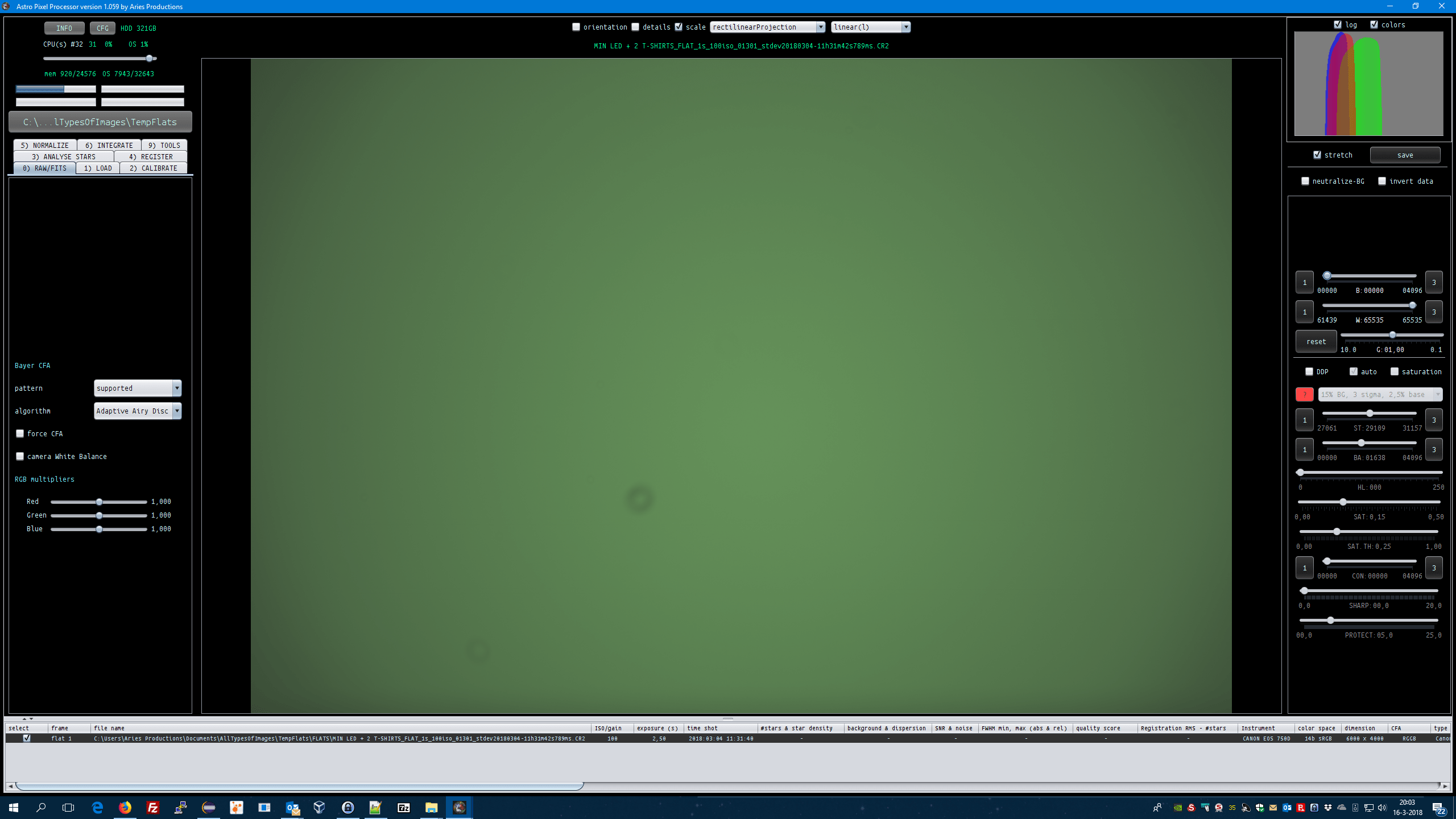 This flat frame was exposed with ISO100 and 2,5 seconds exposure time. If 5 seconds was used, the histogram would have hit the right side in the green channel and clipping would have occured which we need to prevent. This flat frame is well illuminated 😉