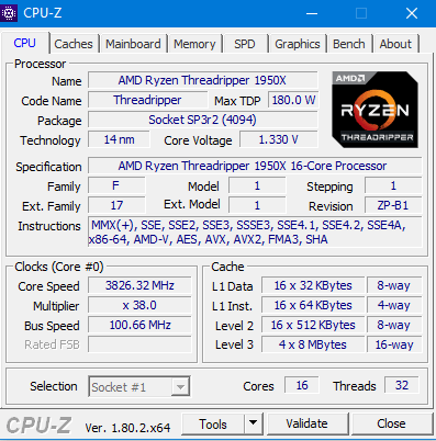 AMD Ryzen Threadripper 1950X 16cores / 32 threads running at 3,8 GHz.