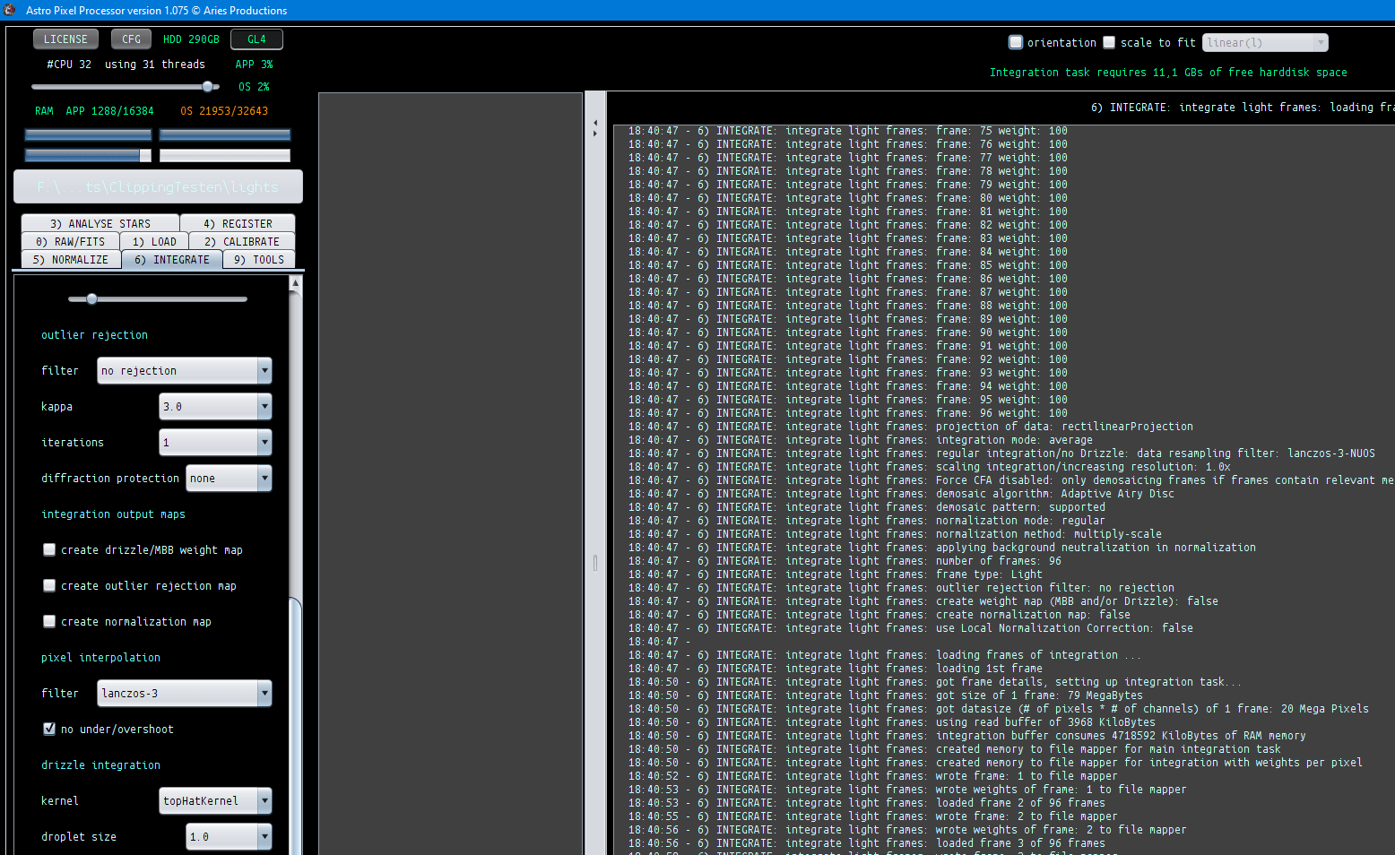 My hard disk is 233 Gb of which 50 Gb were free before starting the integration. During the integration a popup was shown that I was running out of disk space so I chose the "let's try anyway" option and the integration basically failed (lots of banding in the final result). So I freed up more disk space so 75 Gb were available and started APP again. This time the integration succeeded but a pop up was shows that only 4 Gb of disk space remained.