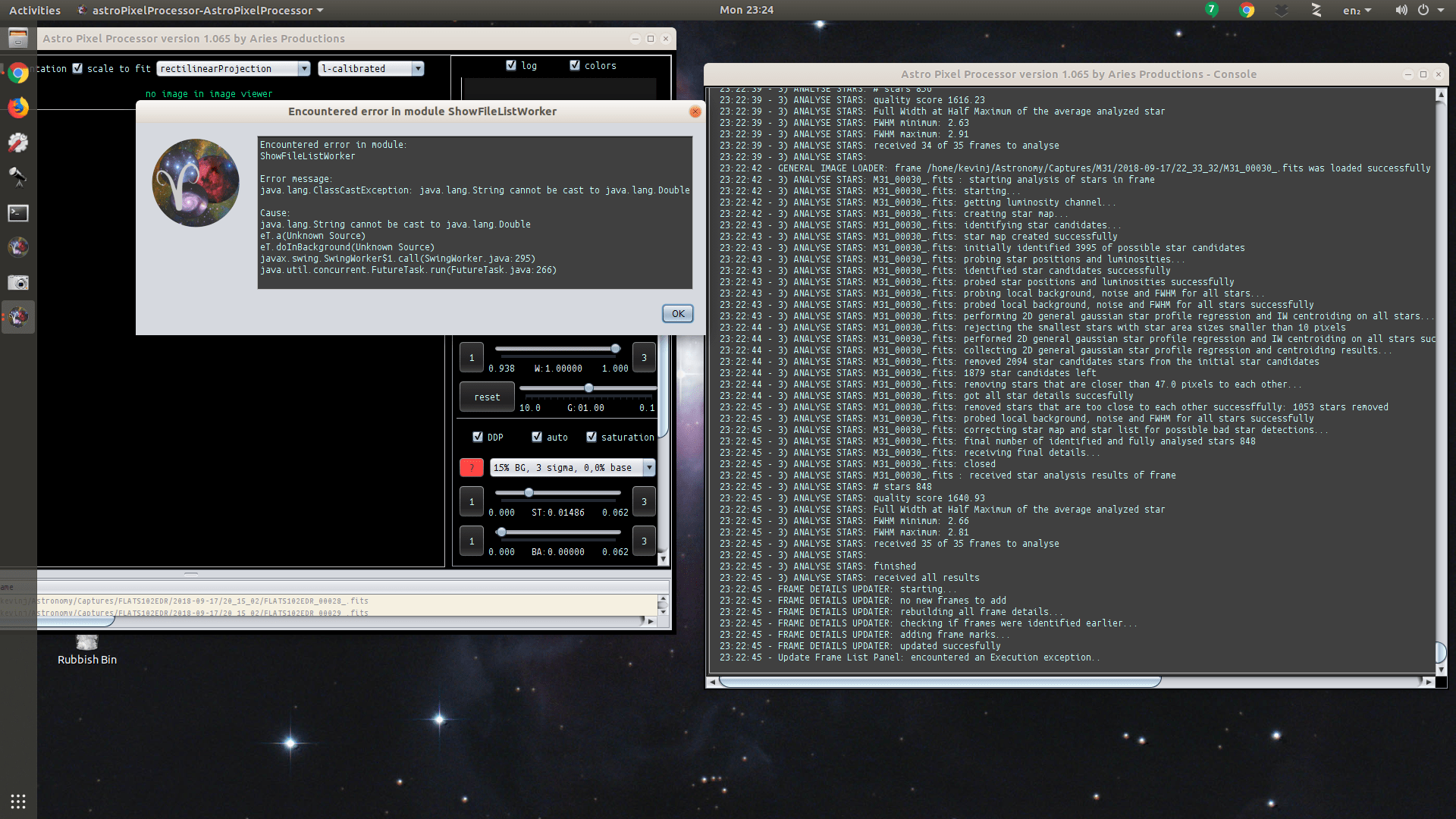 The issue is related to the file listing box. It appears you may have some issue in that the amount of files displayed possibly doesn't match the files loaded, thus causing an exception or some other leak because after getting the frequent ShowFileListWorker exception I went to process an entirely different set of data where I cleared down only my Lights and any artefacts related to that previous session - and it kept failing on Analyse Stars saying it couldn't find a file, which did exist on my filesystem. I ended up closing APP and restarting again (something very frustrating as I was doing a new multi-session - we really WANT project save/load!)