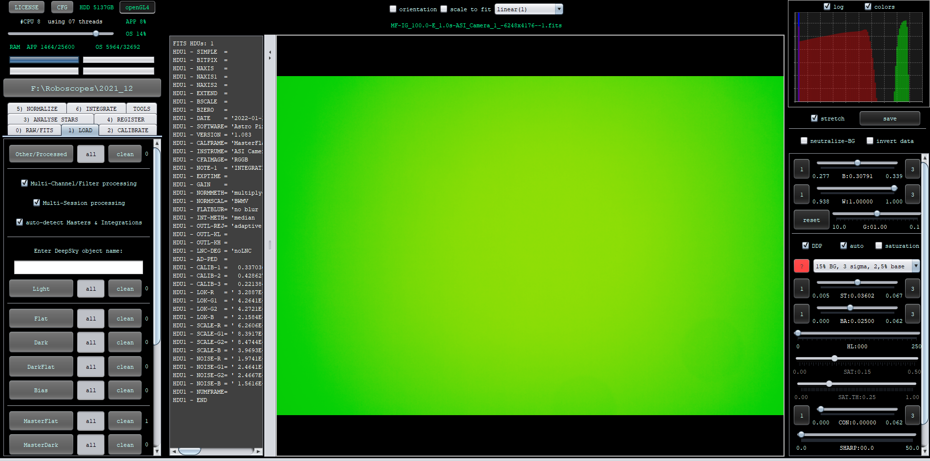 Next I applied Master bias and Master dark to one light.