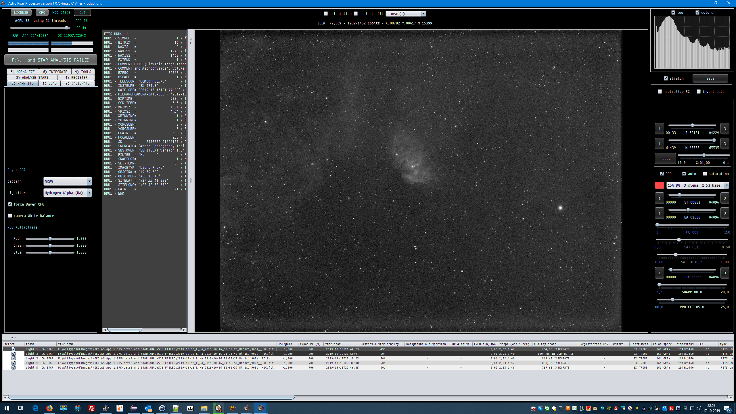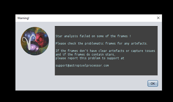 Hello to all, I am trying to process my calibrated subs with App 1.075-beta6 and fail due to STAR ANALYSIS FAILED error..
