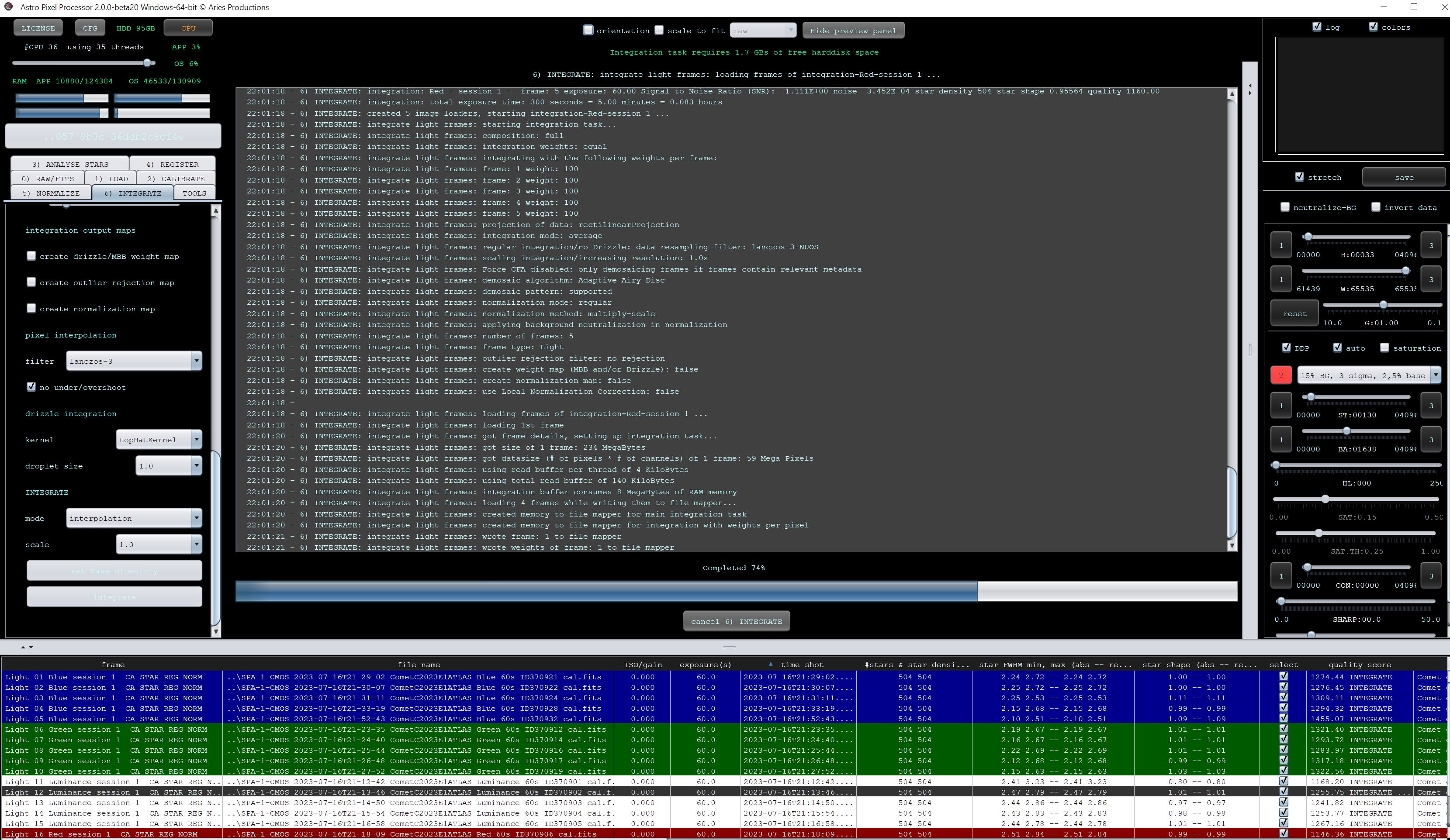 I tried to do a short integration on Comet C2023E Atlas, only 5x each of LRGB at 60 seconds each, and it hit 74% on integration, then stayed there for over 12 hours in a completely unresponsive state. I finally used task manager to kill it this morning. I had 97 gb free space on the C drive which I was using for everything, a 400gb Intel 750 nvme drive. I have plenty of RAM at 128gb and an 18 core/36 threat Xeon in this computer with an AMD 6900xt video card so it shouldn't be resources. Here is a screenshot of it: