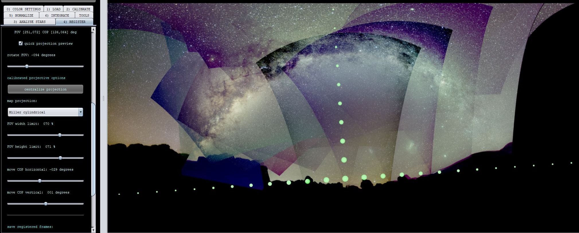 The next images will show 1 example using the quick projection preview. The example really shows the power of the quick preview. It is an 18-panel mosaic with a big Field Of View showing the horizon and the Milky Way. This example needs a good choice for the map projection, Miller Cylindrical in this case, and a change of the Center Of Projection to have a horizontal horizon.