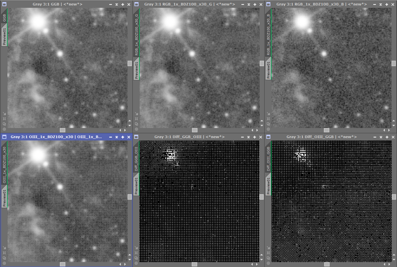 Top center is Green channel from HaOIII_color in bayer drizzle mode Top right is Blue channel from HaOIII_color in bayer drizzle mode As you can see, no checkerboard pattern in these images even if they come from a bayer drizzle intergration of just 30 subframes. To build a OIII image, I mixed the Green and Blue channels with formula (2G+B)/3. I called this image GGB. As you can see in top left image, again, no pattern visible.