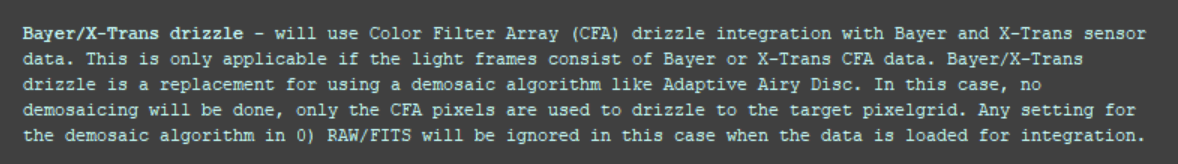 @mackiedlm Isn't it so that when using bayer drizzle or x-trans the bayer CFA settings under tab 0) gets ignored?