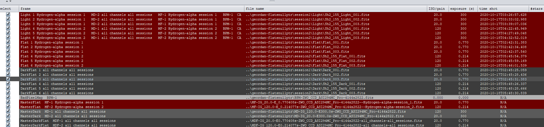 Ok, so I used 1.082, used the "extract Ha" algorithm and loaded all frames in properly. I did assign the darks to all sessions as those shouldn't change much in between if at all (usually based on temperature then). I had no issues assigning them to the lights and the masterdark took are of the amp-glow pretty much ok. I know this doesn't help you much, the problem is however that it's very difficult to find a possible bug if I can't reproduce it. I attached my file list, maybe you see me doing something slightly different?