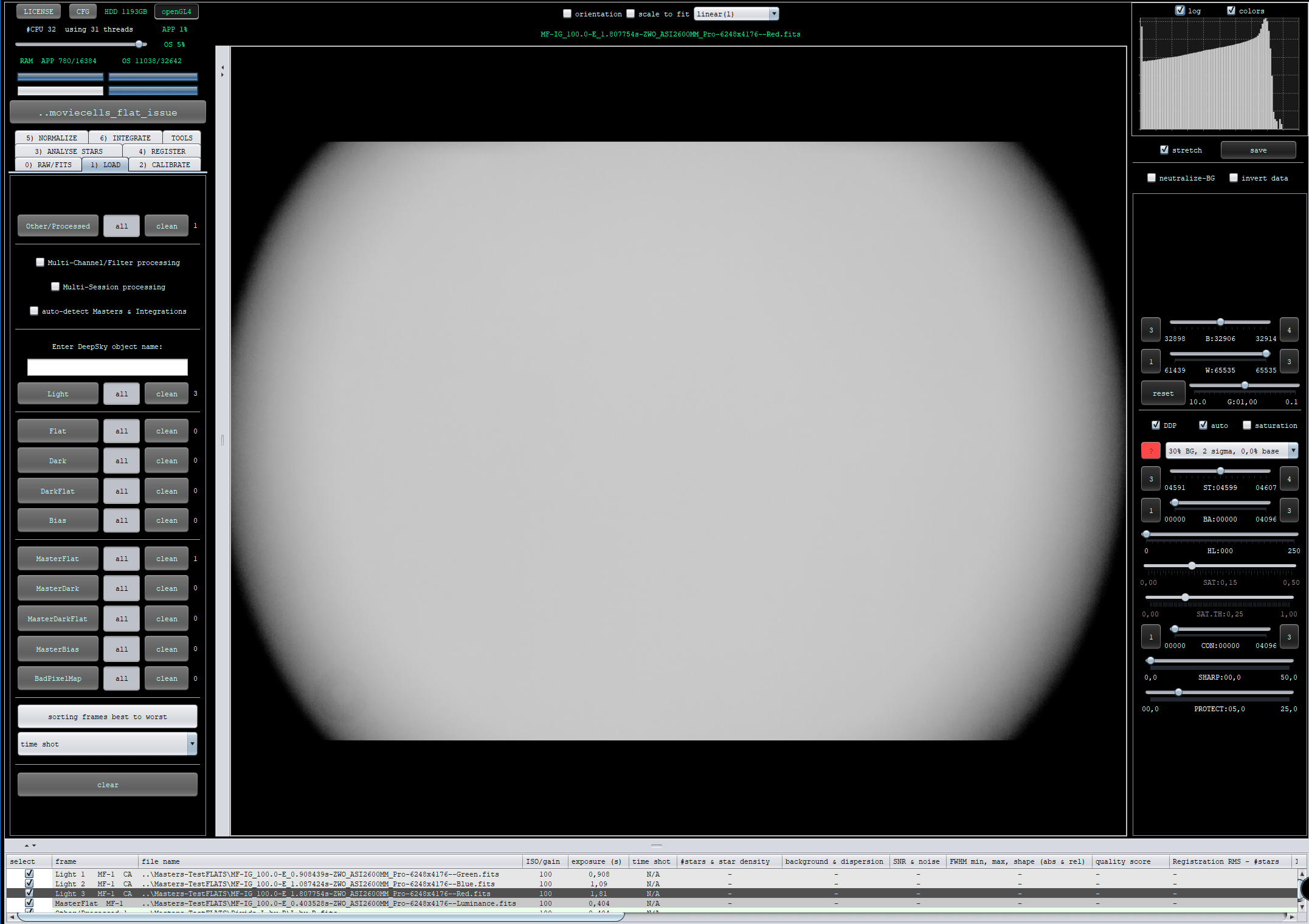 This is what I get when I load the Red masterflat as a light and use the luminance masterflat as a masterflat. First the masterflat is shown, then the division by the other MasterFlat. Please note, the multi-channel and multi-session functionality is disabled to perform this test. auto-detect Masters and Integration in 1)Load is also disabled.