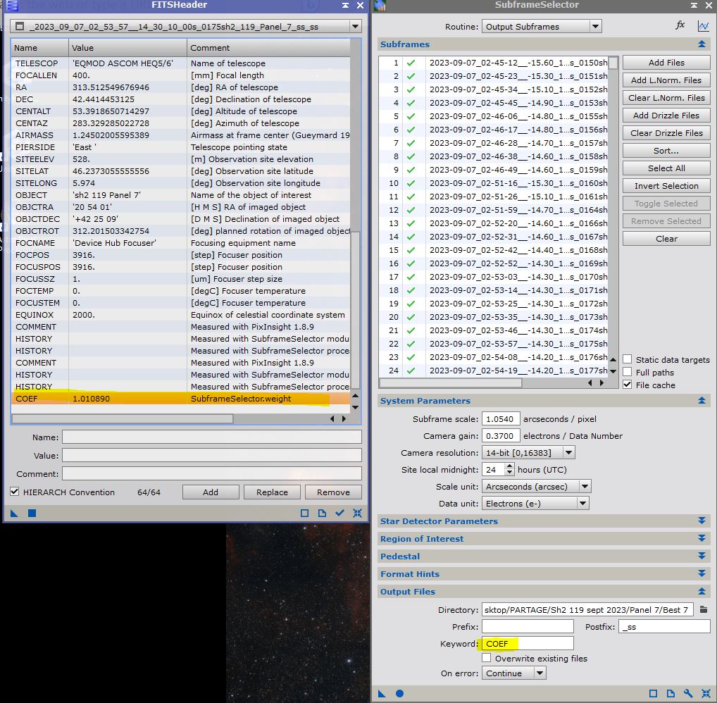Hi Mabula! Thank you very much for your answer. I would like to create a weighting for each image when integrating. The weight value coming from subframe selector from pixinsight for each image calculated from parameters such as noise or PSF. The calculated value would be recorded in the FITS header COEF. (see attached example). Is it possible?