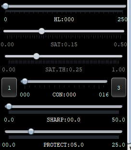Now about how the sliders work, these will be improved upon as it's not very standard. On the left of a slider you see the value of 1, on the right 2. This is the coarsest setting and when sliding a slider, the effect will be big fast. If you want finer control, you click on the right button to decrease sensitivity and with the left to increase it again. Each time you change a slider, the preview image will update for you to see the effect.