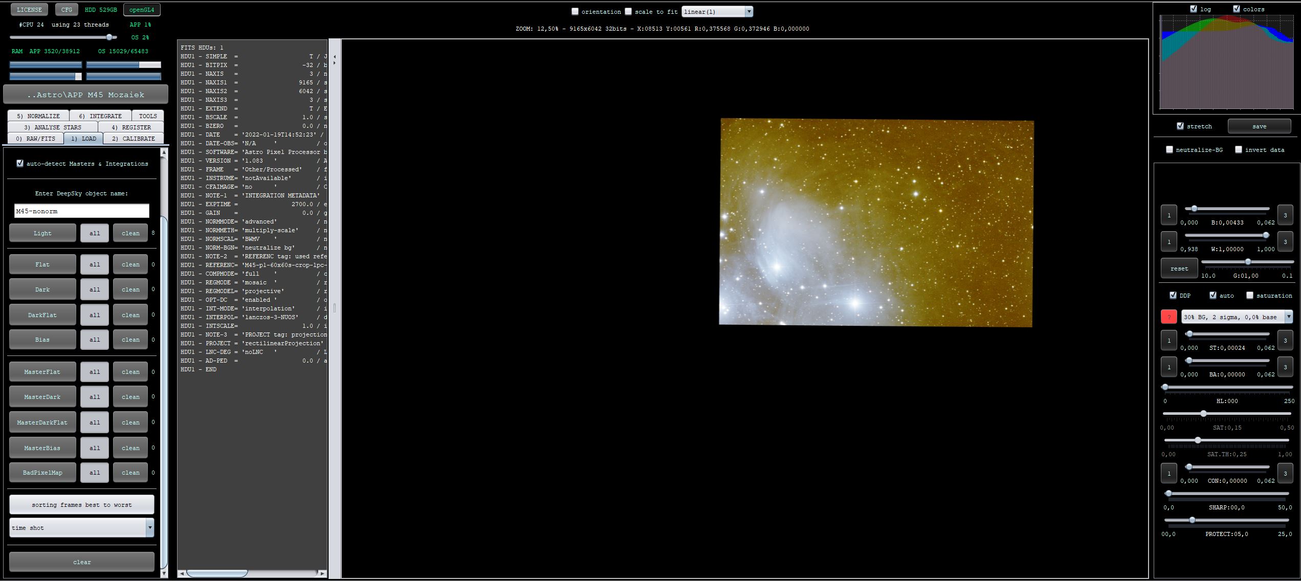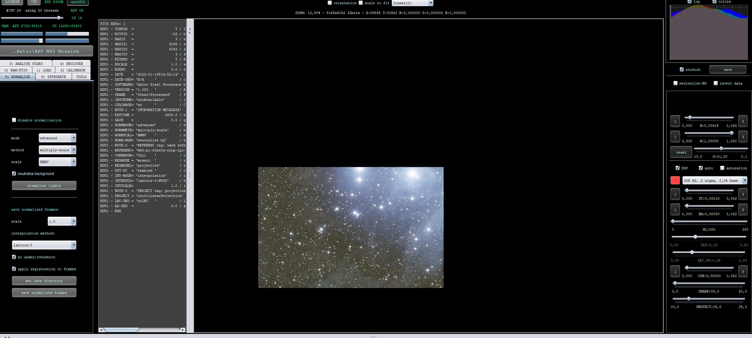 I did not use any calibration frames in this mosaic processing as these images had been integrated as individual images (and corrected for LP) before. The result of that is in the very first (composited for convenience to see the panes, the overlap and the orientation) image at the top of this thread: Normally colored images.