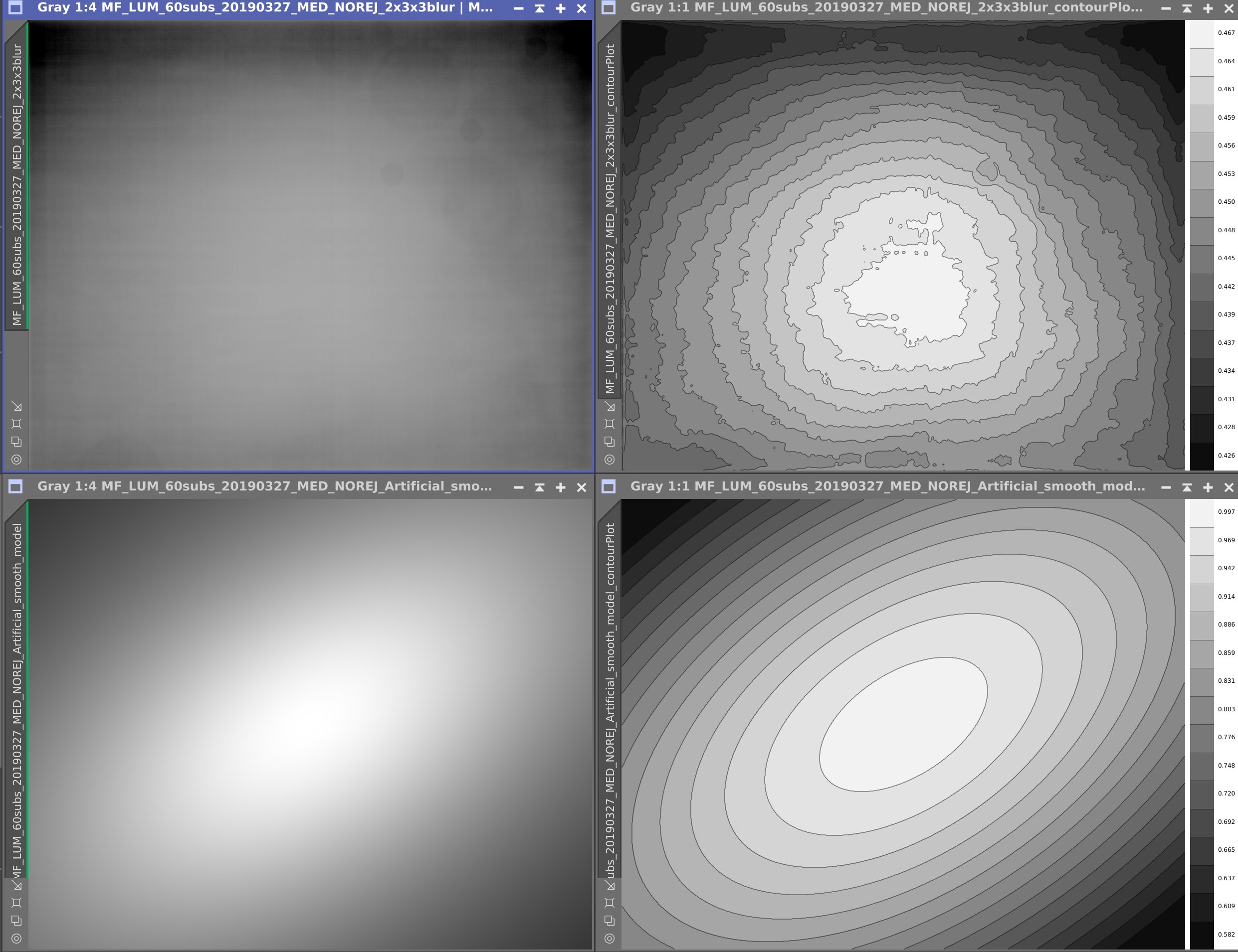 For a target with real faint background features i am optimizing my luminance masterflats. I made 60 flats, loaded them with masterbias based on 256 frames and the BPM. I want to test different masterflat methods and also made a smooth model masterflat that should show only the vignetting (I used v1.071). My imaging train has very little vignetting and only the "upper" corners show up as darker. The smooth model masterflat is smooth, but does not show the typical upper corner vignetting, but upper left, lower right pattern. See attached Pixinsight boosted autostretch images and flat contour plots. What is wrong here? (Seems like a symmetry axis oversimplification?)