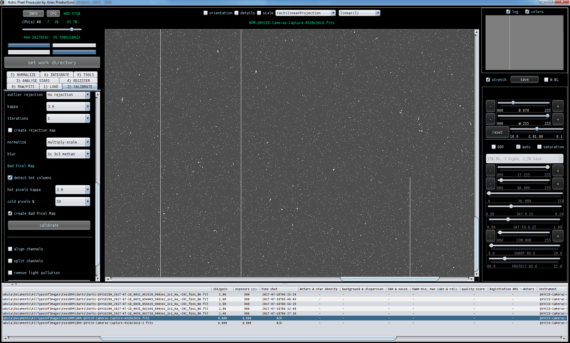 - Improvement, BPM creation, added hot column detection for CCD sensors. This will significantly improve the handling of hot columns in calibration. First image: masterdark of 5 darks of a QHY16200 CCD camera showing bad/hot columns. Second Image: BPM of the same 5 darks without hot column detection, notice that 2 of the columns are only partially picked up as hot/bad pixels. Third image: BPM of the same 5 darks with hot column detection, notice how the bad columns are picked up completely now.