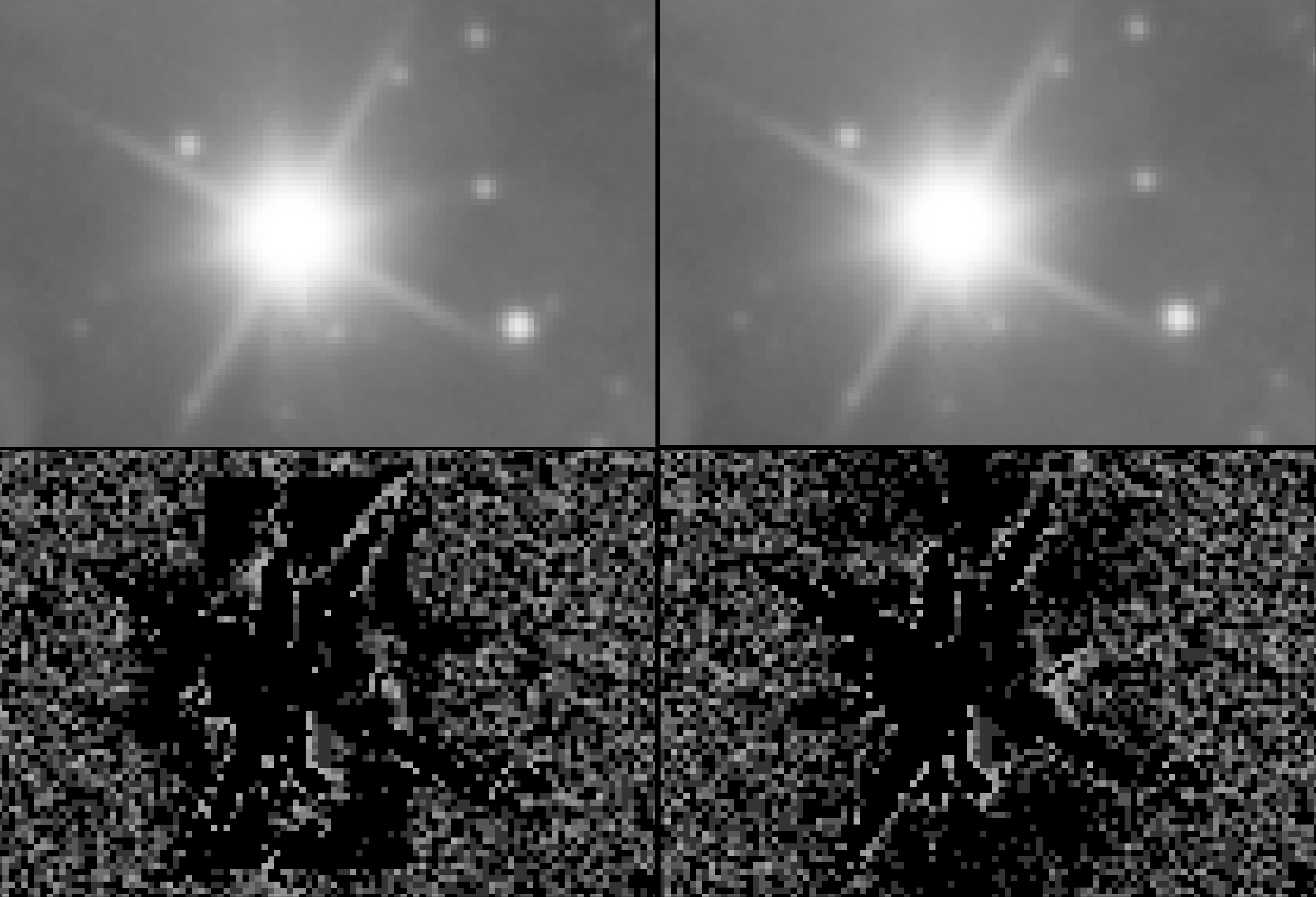• UPGRADE, IMPROVED, Local Normalization Outlier Rejection Filters, in 6) Integrate, you can choose from 4 different Local Normalization Outlier rejection filters. All 4 filters have been upgraded. Local Normalization Outlier Rejection is an innovative way to correct pixels values relative to each other before outlier rejection filtration is performed. It improves the robustness of outlier rejection and therefore is better at preserving real signal and thus better Signal to Noise ratio when compared to other outlier rejection filters like Linear Fit Clipping which is used in other applications as a way to correct pixel values relative to each other before outlier rejection filtration. The current upgrade includes local interpolation at pixel level between the local sky background values which were found when the integration layers were analysed before the actual integration starts. The old Local Normalization filters could give artefacts on bright stars, especially when data from different camera's and telescopes were used or if the star sizes and diffraction patterns change significantly between the frames to integrate. The following image shows such an artefact on H-alpha data combined from 5 different telescopes + camera's. On the top, you see the integrated data. On the bottom the Outlier Rejection Maps, which shows where pixels were rejected. The left side is from the old LN filter, the right side is from the new filter. Not always, is the artefact clearly visible in the integrated result, in some cases it is clearly visible. The outlier rejection map clearly shows that with the old filter, the rejection is not done uniformly or consistenly between adjacent pixels. With the new filter, thanks to local interpolation on pixel level of local background values, this artefact has disappeared. Please note, diffraction protection was enabled in this example which causes the diffraction spikes to be protected.