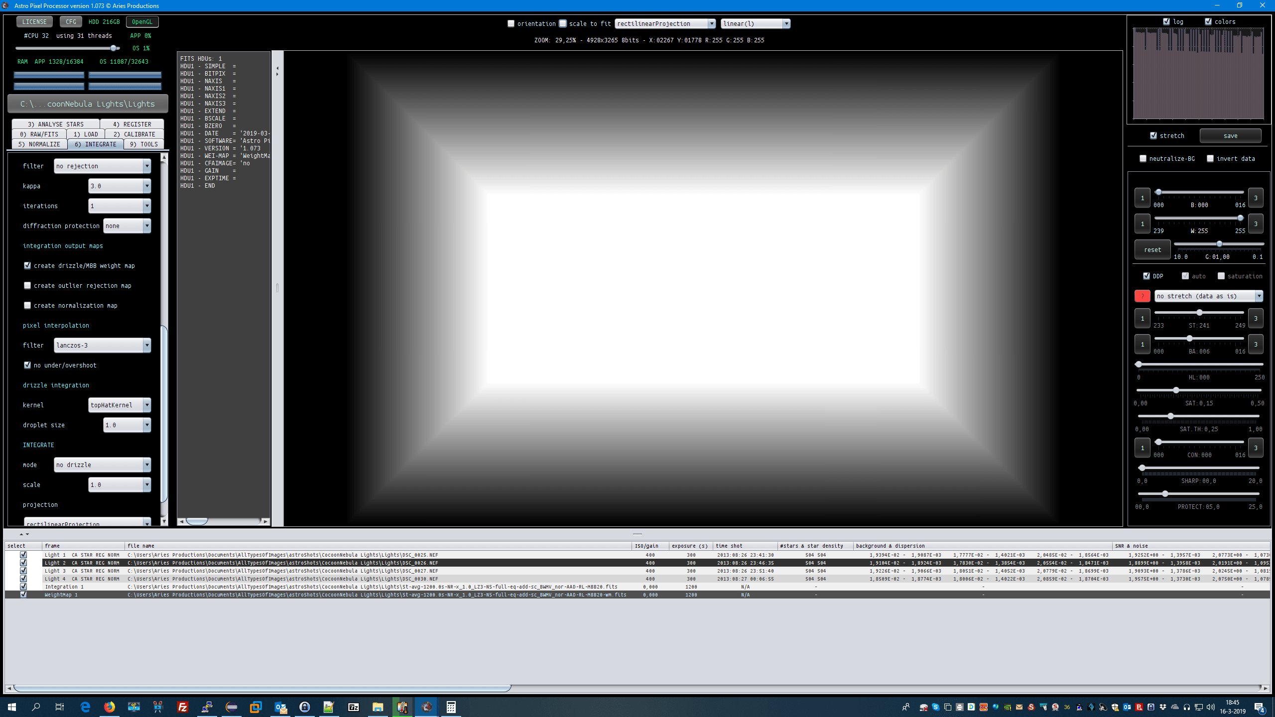 • IMPROVED, DRIZZLE/MBB INTEGRATION OUTPUT WEIGHT MAP, the weight maps, are now properly scaled in 8bits depth. They used to be scaled in values of 0-100, now they are from 0-255. However, actual application of weights in integration is done in 16bits, because integration weights, drizzle weights and MBB weights are all combined to give a pixel in integration a certain weight.