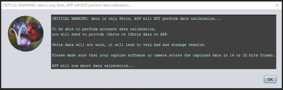 - IMPROVED, DATA CALIBRATION, APP will now issue a clear warning if the calibration data only contains 8bits data. Performing data calibration on 8bits data with 8bits masters will never work properly or give satisfactory results, so APP will simply warn the user that the data is insufficient and it will abort data calibration on the light frame.