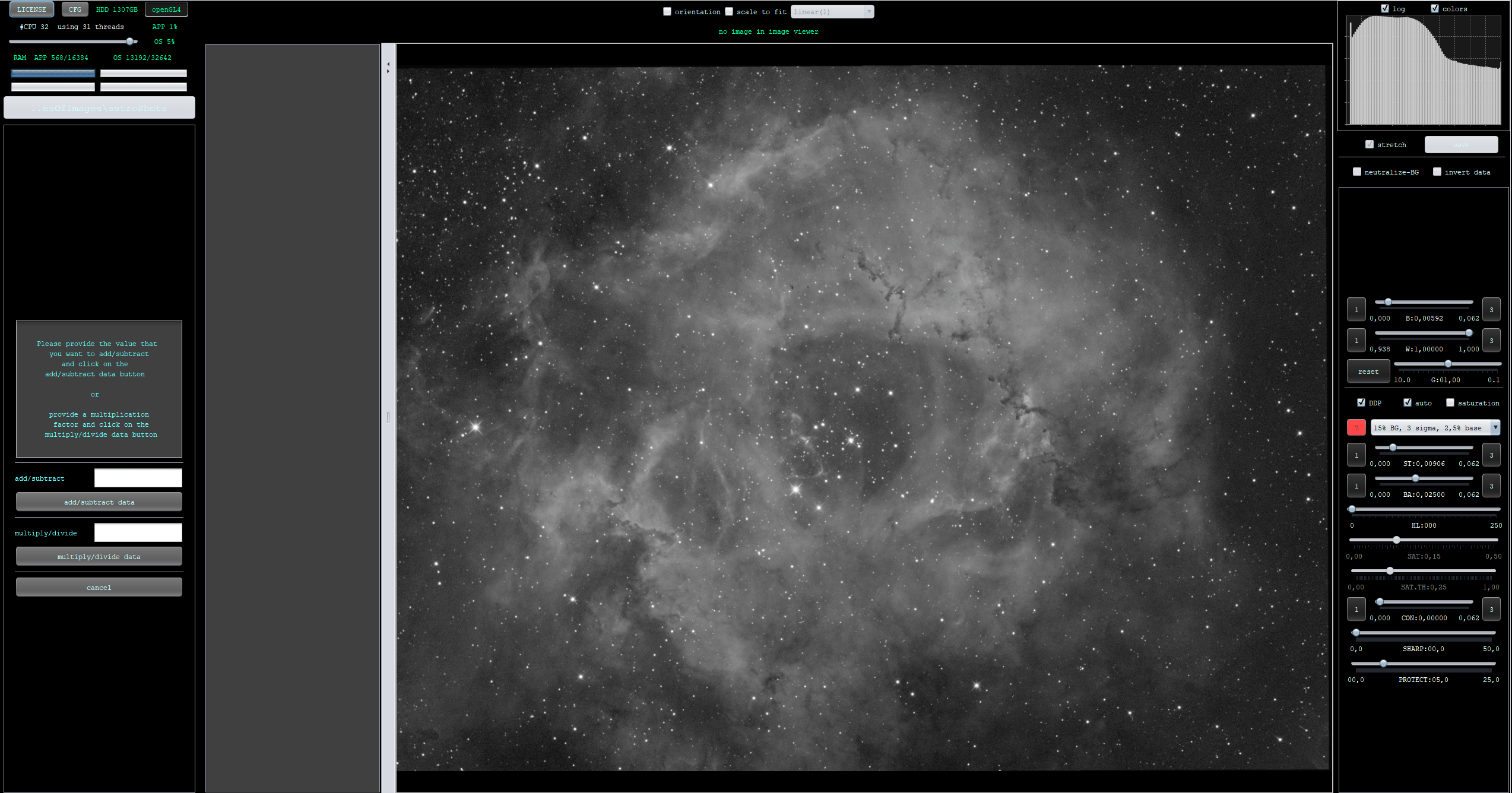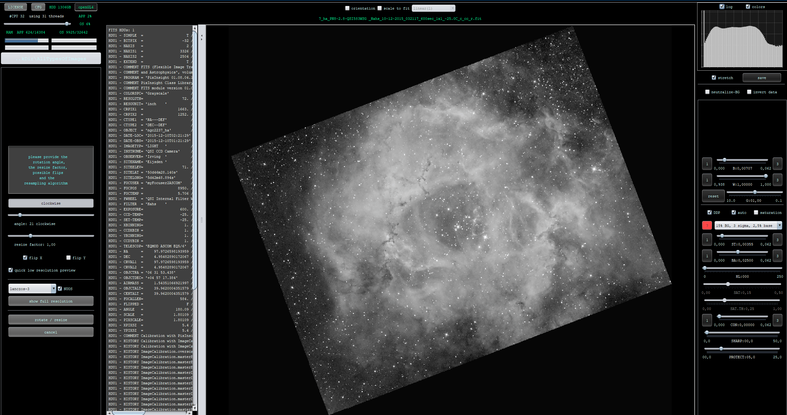 - IMPROVED, ANALYSE STARS, the star detection algorithm has been improved once again because we received some data where it failed. This concerned data of long narrowband exposures where a lot of cosmic rays were present in high numbers... which confused APP. It thought that the cosmic rays were stars... We have made sure that the new algorithm works properly on all of our test data. In addition some optimizations were applied as well, so module 3) Analyse stars is now 10-20% faster 🙂 Please check this example were APP 1.082 failed and 1.083 works, a 30 minute H-alpha exposure with many cosmic rays.