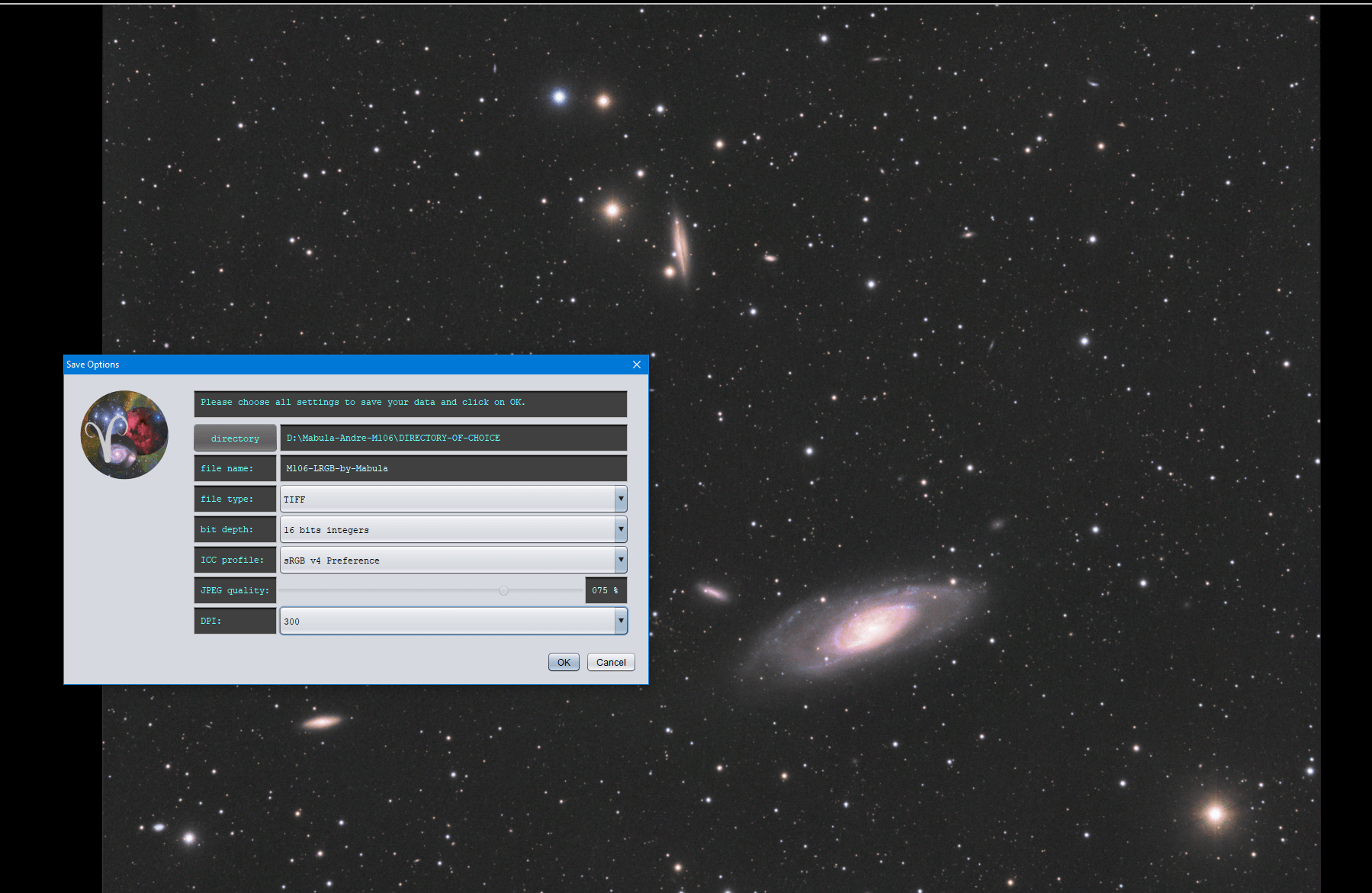 - NEW FILE SAVER MODULE INCLUDING PNG WRITE SUPPORT, DPI AND ADDITIONAL ICC COLOR PROFILES, file saving in APP has been completely upgraded. This upgrade is applied in the whole application where frames are saved and it should solve many requests regarding file saving in the application. It is used when masters are created, your light frame integration/stack, when you save with the preview filter and in all the batch tools. Especially in the batch tools, the file saver is new much more user friendly. You only need to set the save settings once for whatever file type that you choose and the batch will be saved in the same way, without ever asking file save settings again. The file saver now is just one panel that allows you to set all file save options which are, directory of choice (no more saving in only the Working Directory), file name of choice, file type (FITS/TIFF/PNG/JPG), bit depth (depending on the file type, 8/16/32 bits), ICC profile for TIFF/PNG/JPG, JPEG quality. The new file saver also includes the option to set Dots Per Inch (DPI, for printing purposes) for TIFF/PNG/JPG frames. Finally, the file saver includes many more ICC color profiles (no profile for linear data, sRGB v2, v4, ColorMatch RGB, Adobe RGB 1998, Apple RGB, Wide-gamut RGB, ProPhoto RGB) to use which can be needed for printing purposes, or for moving the non-linear data to other applications like Photoshop. Be aware that if your data is still linear, simply save your data without an ICC color profile. So you can also choose to not include an ICC color profile for TIFF/PNG/JPG when the data is still linear. (if you do save with an ICC profile on dark linear data, you will get issues with your data! ICC color profiles like sRGB, Adobe1988, ProPhoto etc... are not to be applied on linear data at all, they are for the non-linear color spaces).
