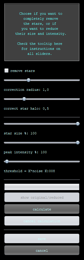 - IMPROVED, STAR REDUCER TOOL, further improvements are made for the background reconstruction of the reduced stars. And a Null Pointer Exception has been fixed which would occur if you pull the sliders while a calculation is in progress.