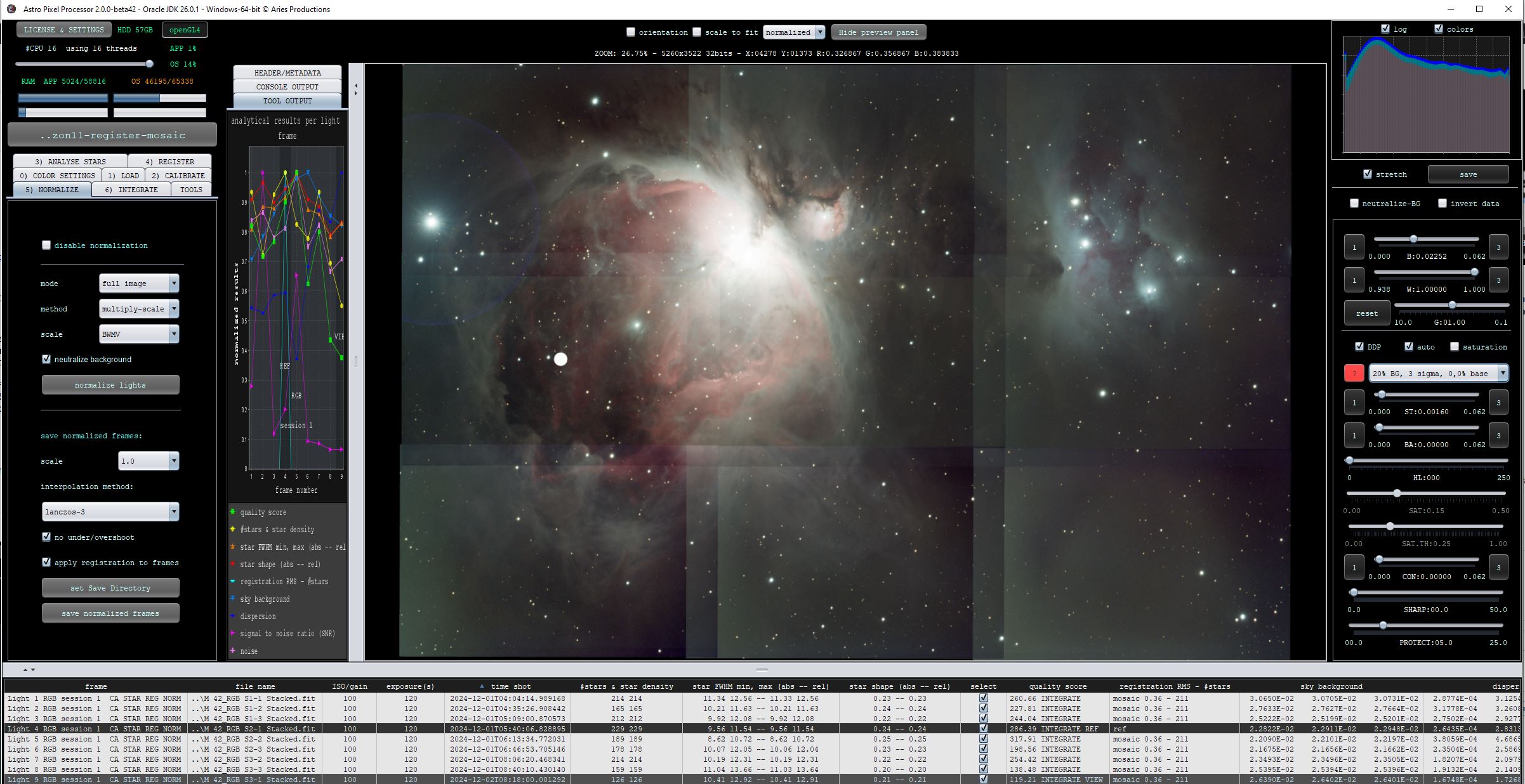 The new engine still has 2 modes, but they work differently and so we have renamed them. The first mode is now called full-image. This mode is most similar to the previous regular mode. The new second mode is called overlap area and this mode is more similar to the old advanced mode. Full-image always analyses each image fully as the name indicates. Overlap area mode will only analyze the overlap area between the image to be analyzed and it's reference frame. If you run a mosaic, and an image does not overlap with the main reference, another frame that does overlap with the image to be analyzed will be used to calculate the overlap area. Simply put, for normal registration where most images overlap almost fully, using any mode will give nearly identical results. if the images have some difference in Field Of View, the overlap area will be more robust because the sky background and dispersion will be based on exactly the same field of view. If however, you run a classic mosaic, like a 5x5 mosaic with only 10% overlap between the images, the full image mode will be best. All is explained as well in new tool tips, the little pop up menus attached to each option. The below screenshot shows the initial normalization of a 3x3 HDR mosaic of M42 with the new normalization engine in Full-image mode. The sky backgrounds already match very well. LNC and MBB only need to do little work to make it a seamless mosaic now.