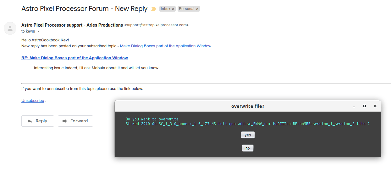 Hi, Can dialog boxes (app modal dialog boxes requesting some kind of action, like Overwrite File No/Yes) be part of the APP application Window and not pop up as the main window? I've just waited 1 hour for an Integration to occur in the background whilst working/writing emails - and I pressed Enter for a new line in email, at the moment a dialog box popped up from APP to overwrite the resultant integration. As the default is Cancel, this frustrating turn of events cause me to scream loudly at my PC and then re-process my Integration. It isn't the first time this has happened.