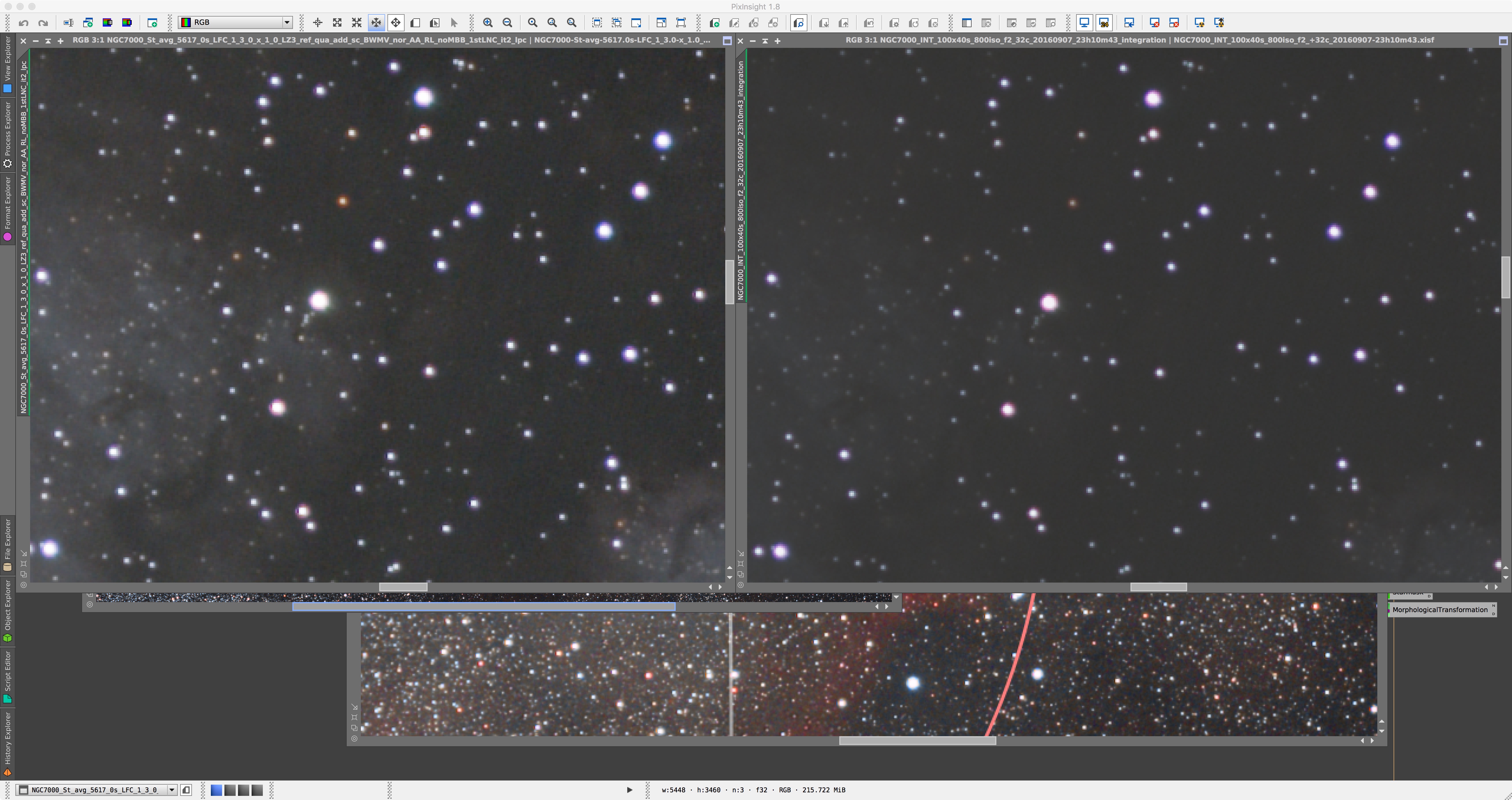 - secondly, to be able to do a good comparision we need to normalize both linear stacks and apply an identical stretch on both stacks. Only then, we are able to say anything about the sharpness, roundness, color edges around the stars and the chromatic noise in the background. To evaluate visually it will help to significnatly boost saturation.