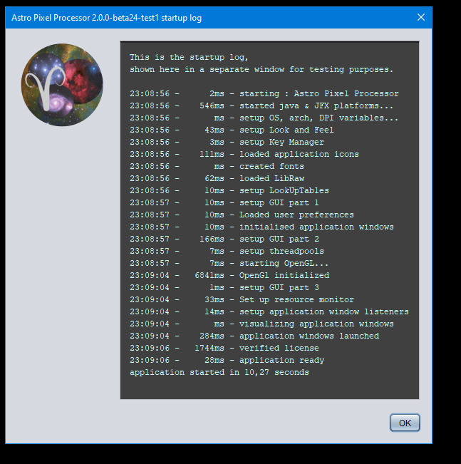 This is the test version APP 2.0.0-beta24-test1, it will popup a separate window with startup details while the application starts and once finished, will present the startup log in an information window which should show as at what stage the application has trouble starting up on your systems. So please install it and start APP and report back how the startup log looks like, so we can better understand the cause of the slow startup and then fix it 😉 !